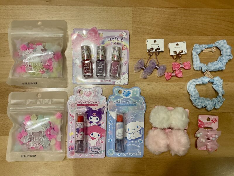 ボックスの中には、お店で買った子供希望の色付きリップや子供用のマネキュア、ヘアゴム、イヤリング、キラキラのキャンディを入れて渡すことにしました。選ぶ時に子供の喜ぶ顔を想像しながら親も楽んで準備できました!(^^)v